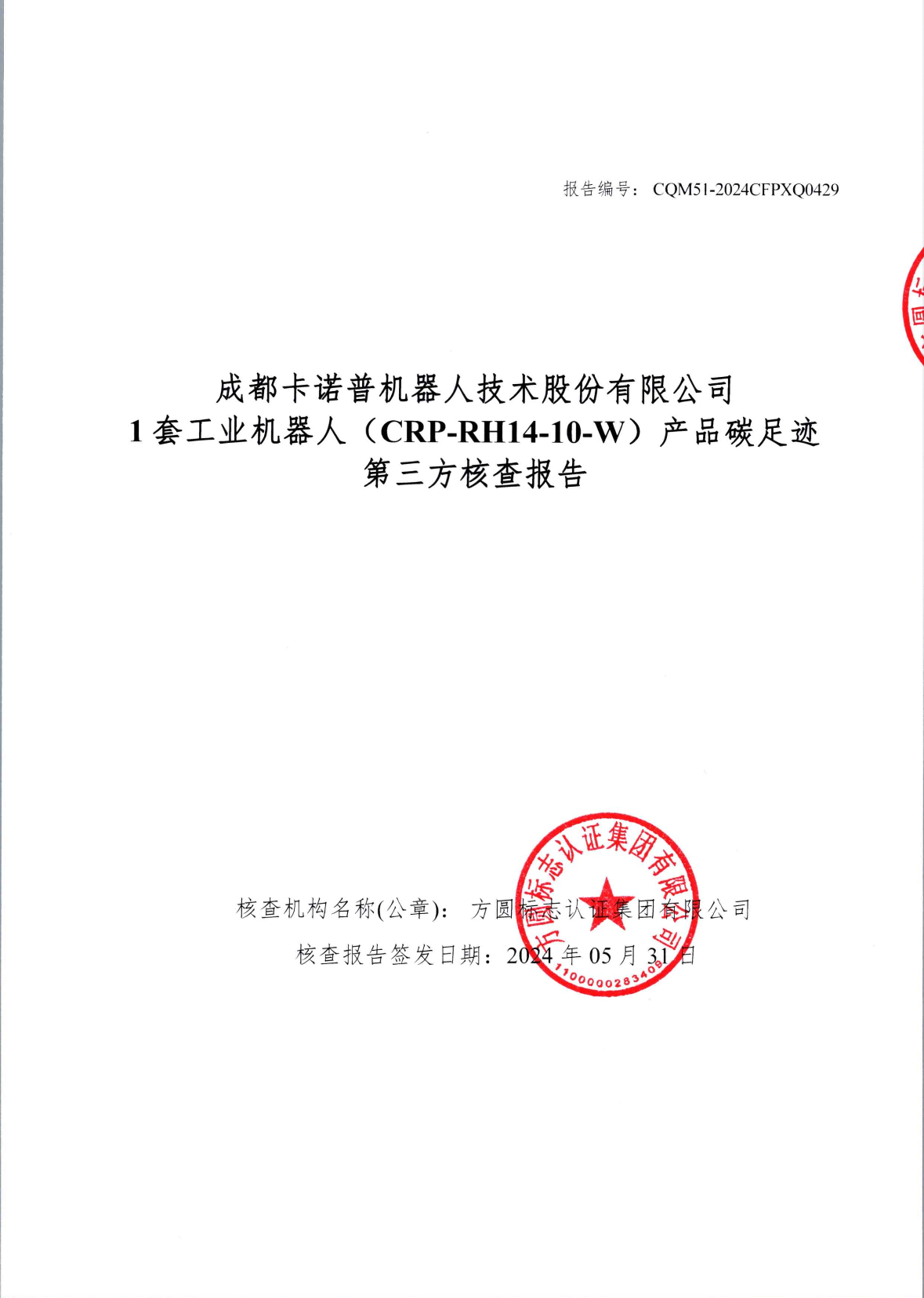 成都今年会电竞机器人技术股份有限公司1套工业机器人(CRP-RH14-10-W)产品碳足迹第三方核查报告